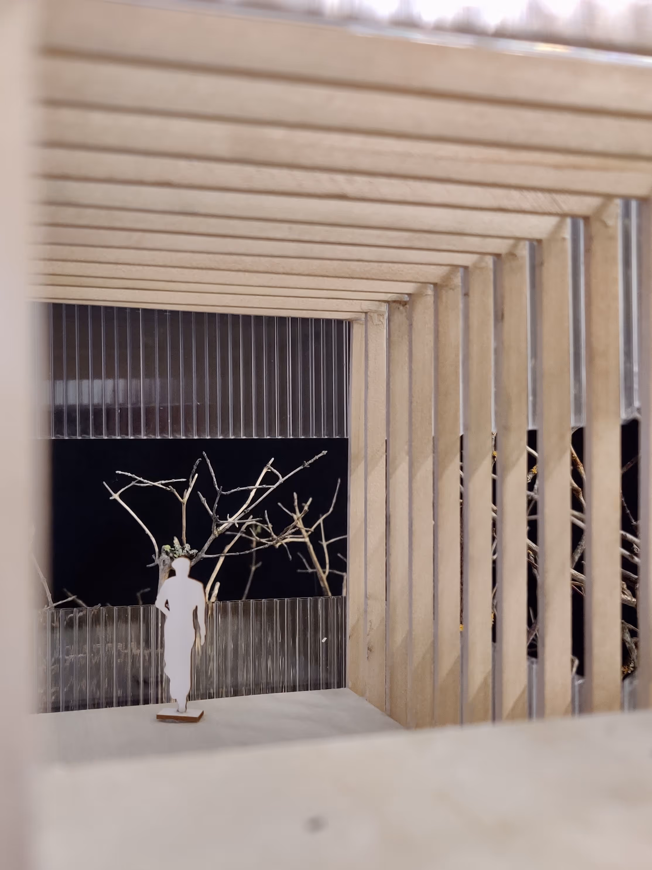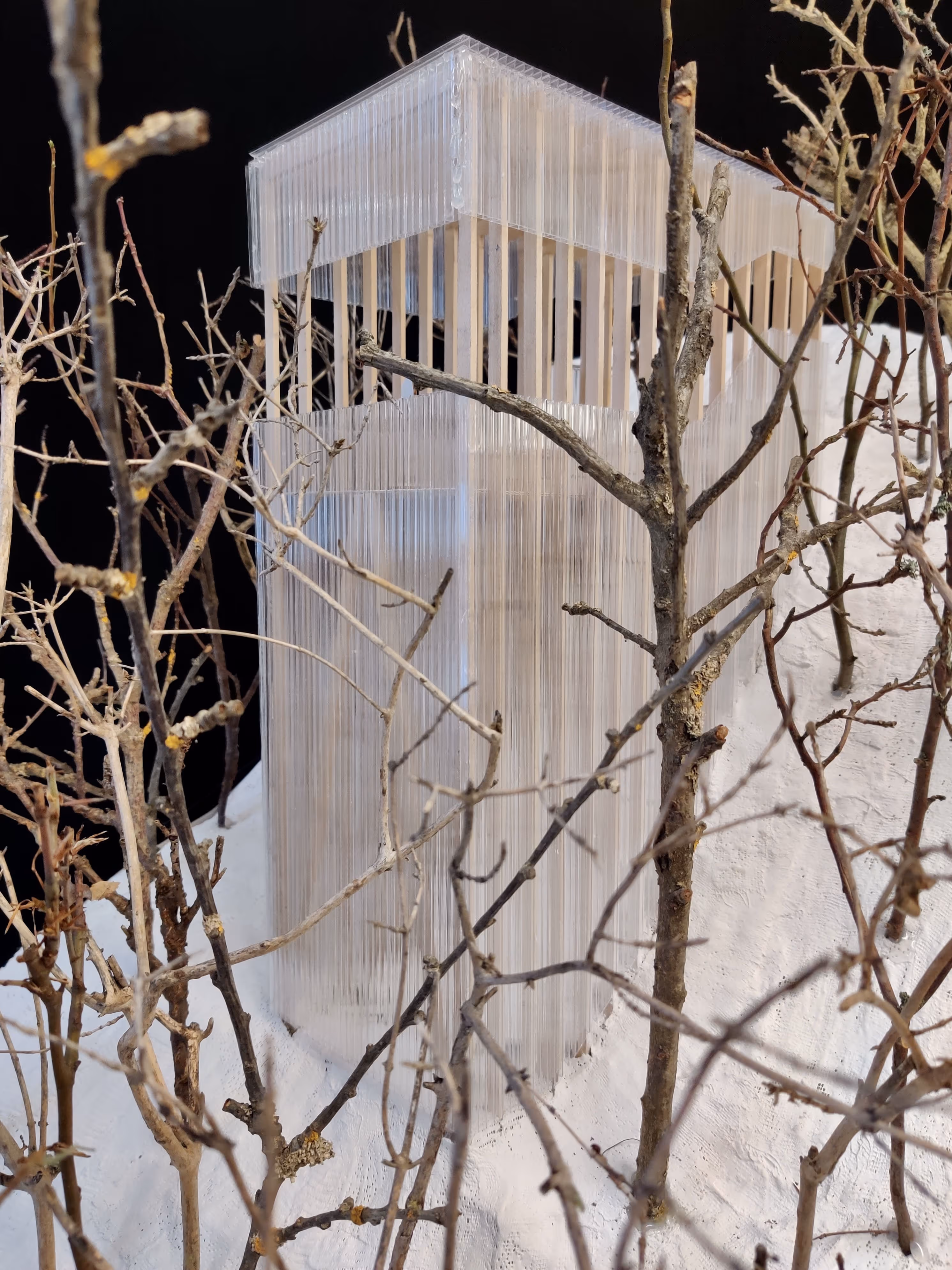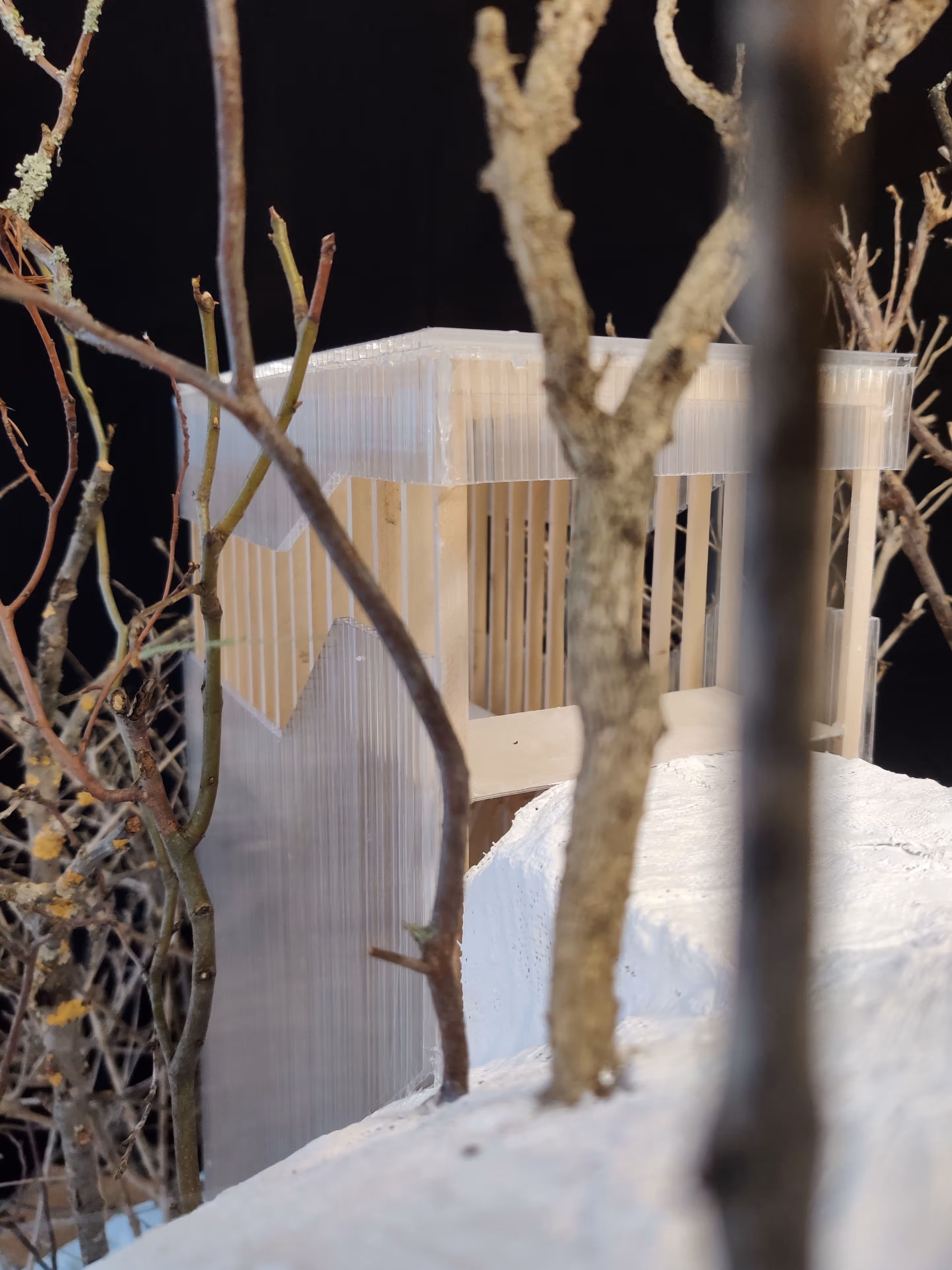Im Entwurfsprozess wurden die Setzung am Hang, Proportionen und die Beziehung von Struktur und Hülle iterativ in Arbeitsmodellen getestet; ein mehrwöchig entwickeltes Präsentationsmodell präzisiert Konstruktion, Fügung und Lichtwirkung.