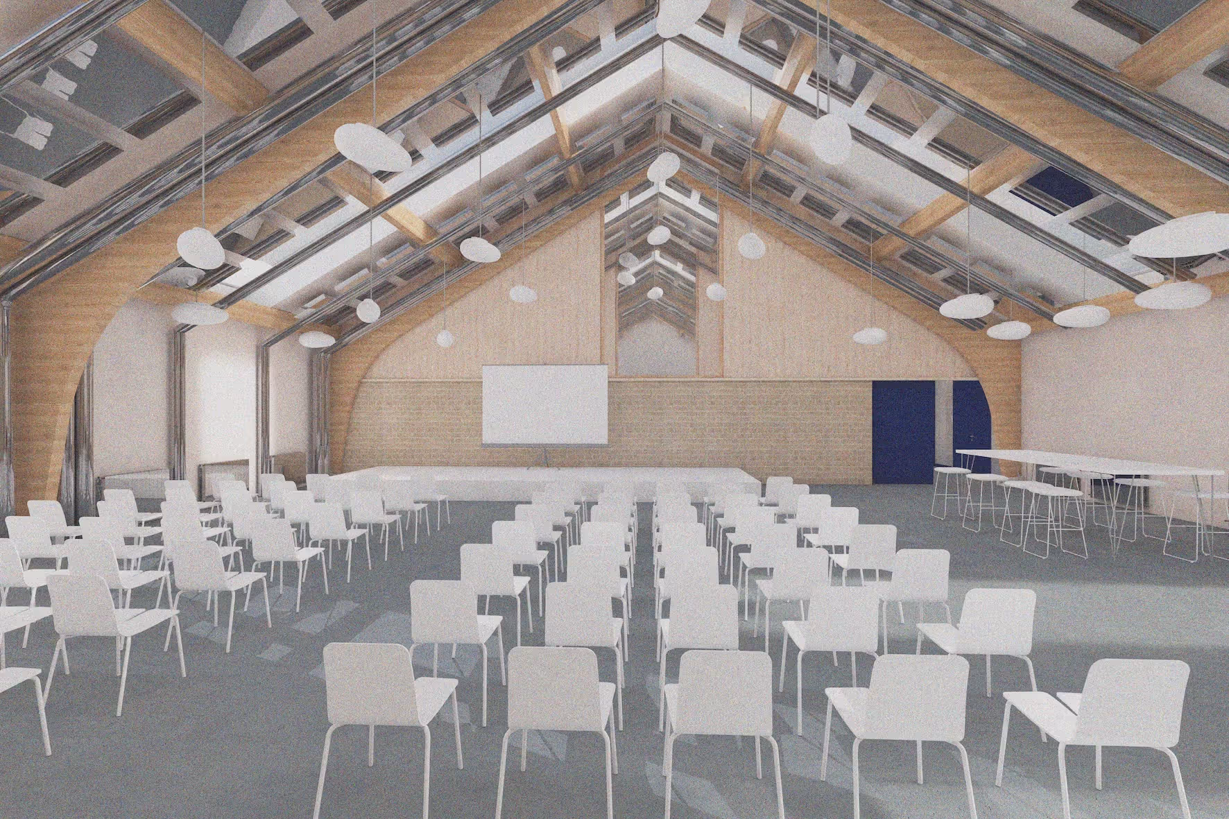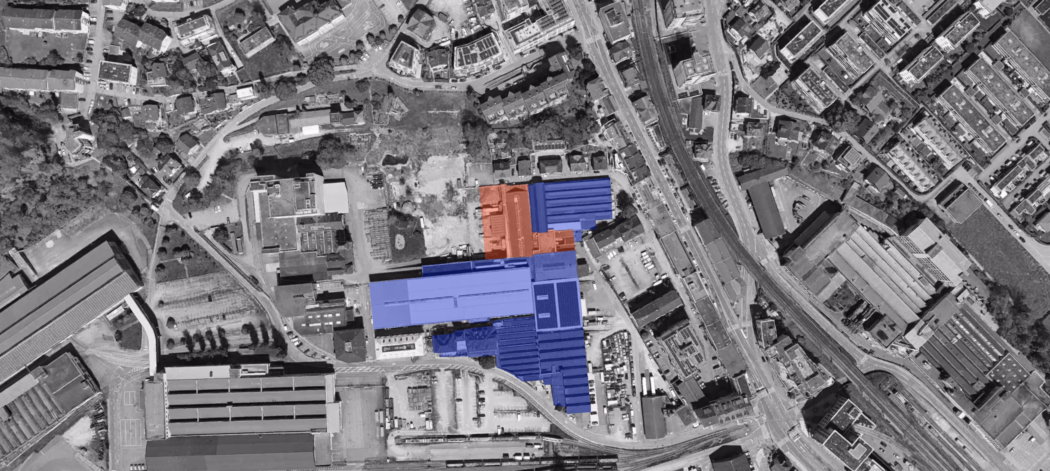 Die Grundidee stärkt das Vorhandene und ergänzt es gezielt: Die charakteristischen Hetzerbinder der Halle bleiben erhalten, die marode Hülle wird erneuert. Ein Neubau schliesst an, orientiert sich im Achsraster am Bestand und bildet zusammen mit dem bestehenden „Balkon“ eine Dreiteiligkeit: Halle – verbindender Steg – Neubau. So entsteht ein robustes Gerüst für flexible Nutzungen, ohne die Identität des Areals zu überformen.