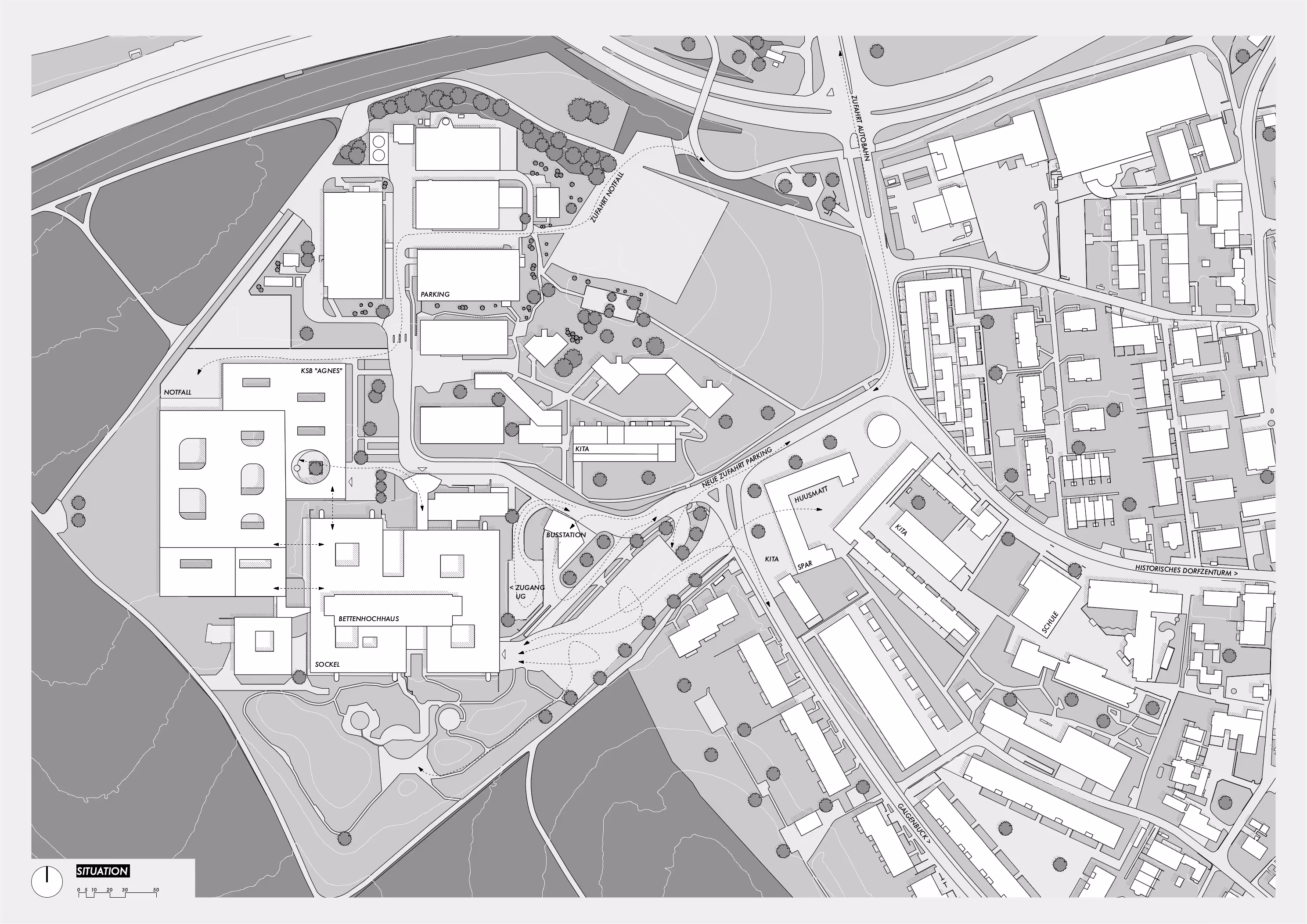 «BRUT» untersucht die Umnutzung des ehemaligen Kantonsspitals Baden in Dättwil – nicht als Rückbau, sondern als Weiterbauen im Geist des Brutalismus. Ausgangspunkt ist die Haltung, Struktur, Material und Systematik sichtbar zu machen und den Bestand als Ressource zu begreifen. Das Projekt reagiert auf den regionalen Wohnraummangel und versteht das Spital als robustes Gerüst für neue Wohn-, Kultur- und Sozialnutzungen. «Brut» – abgeleitet von béton brut von Le Corbusier – steht für Materialehrlichkeit, skulpturale Präsenz und eine ablesbare Ordnung.