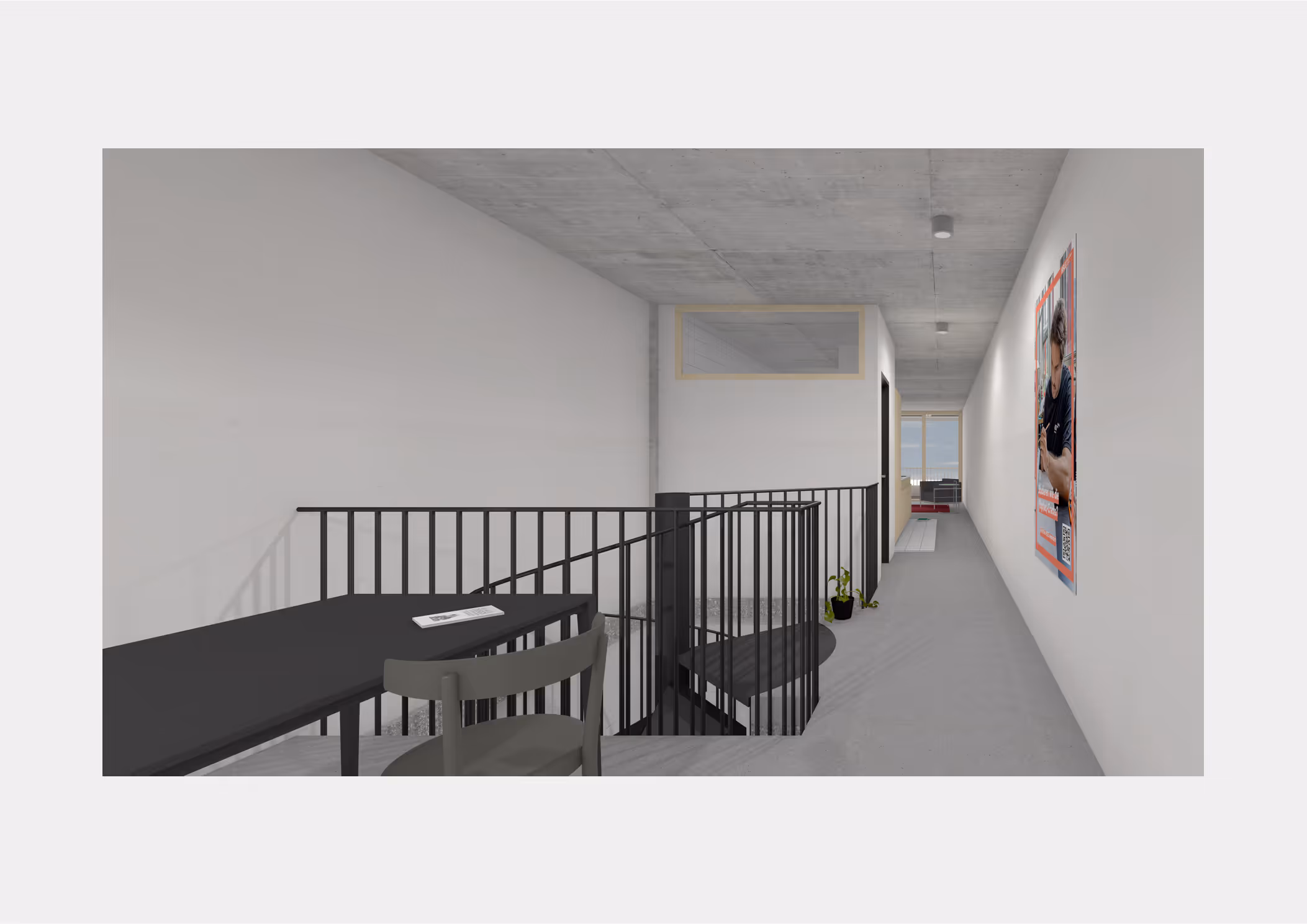 Ergänzende Bauteile wie eine aussenliegende Stahltreppe und vorgehängte Balkonschichten schärfen die Tektonik. Der Abtrag des ursprünglich zwischen Sockel und Turm liegenden Technikgeschosses entlastet den Baukörper und eröffnet Dachflächen für gemeinschaftliche Nutzung und Begrünung.