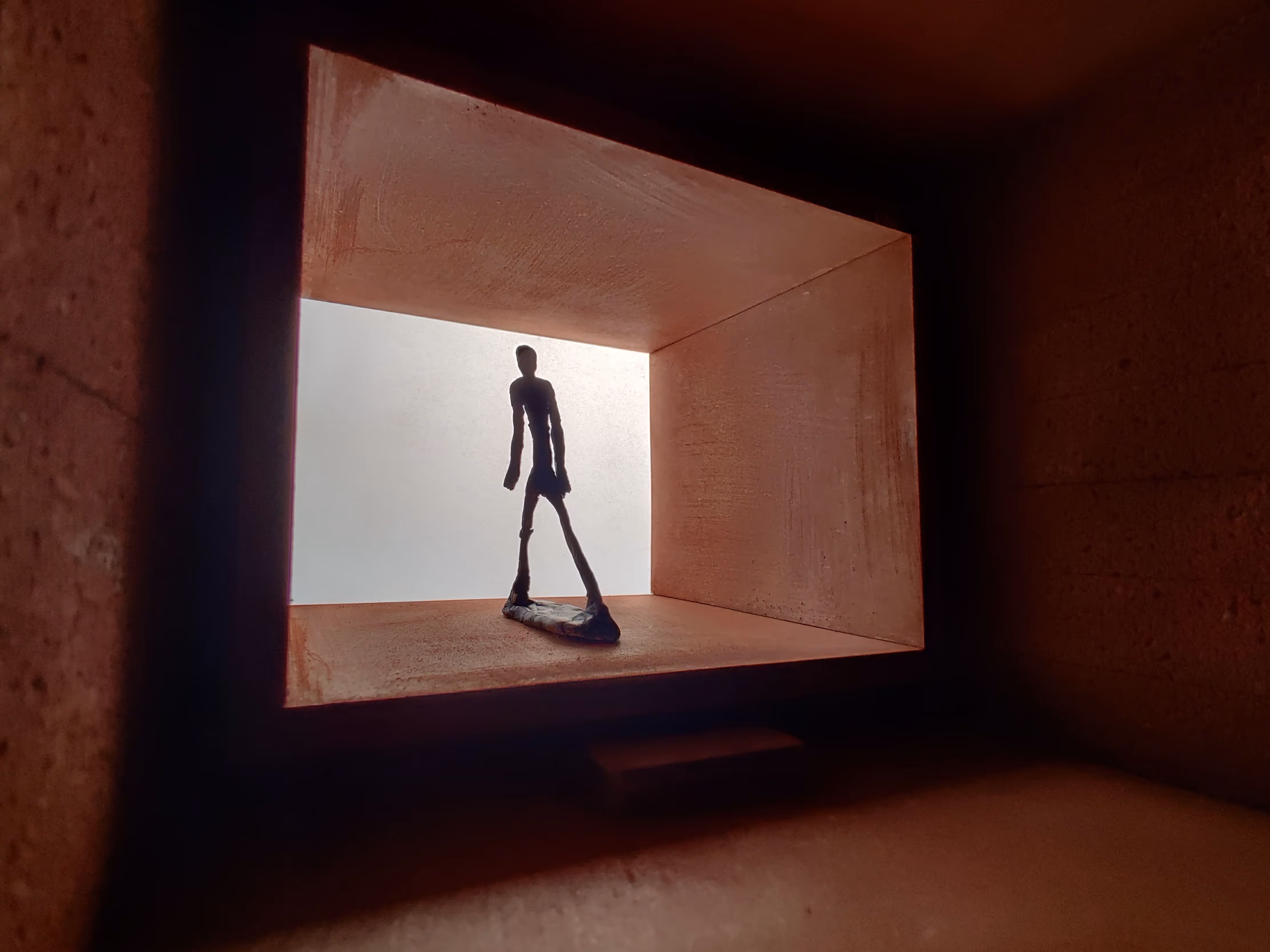 «The walking men II» (Alberto Giacometti, 1960) in diffusem Licht: «Er schreitet ins Licht, in die Ferne. Mit einer Schattenfuge um das Volumen hebt er sich vom Zugangsbereich ab. Ein Tritt lädt dazu ein, sich auf die Plattform zu begeben.»