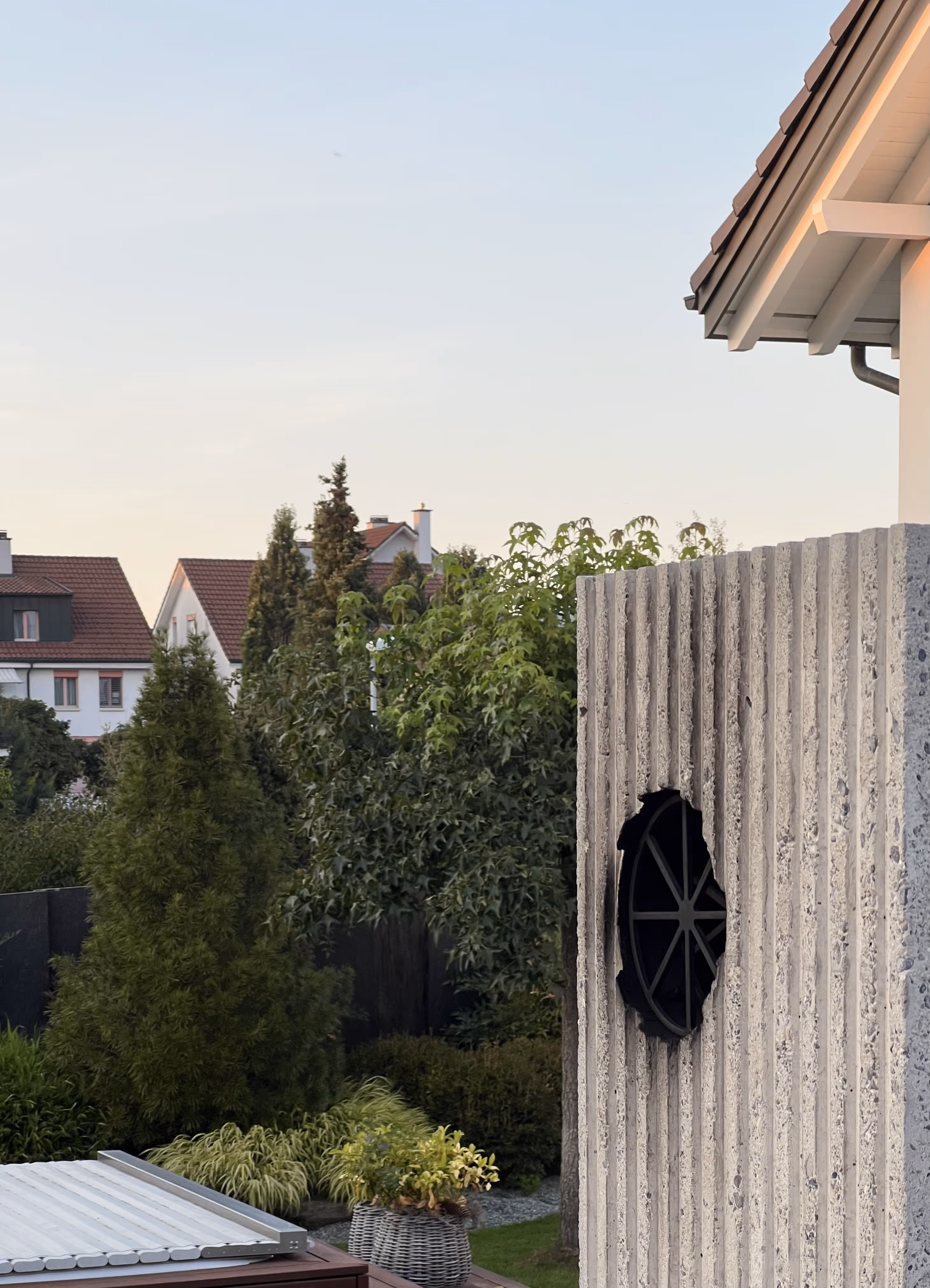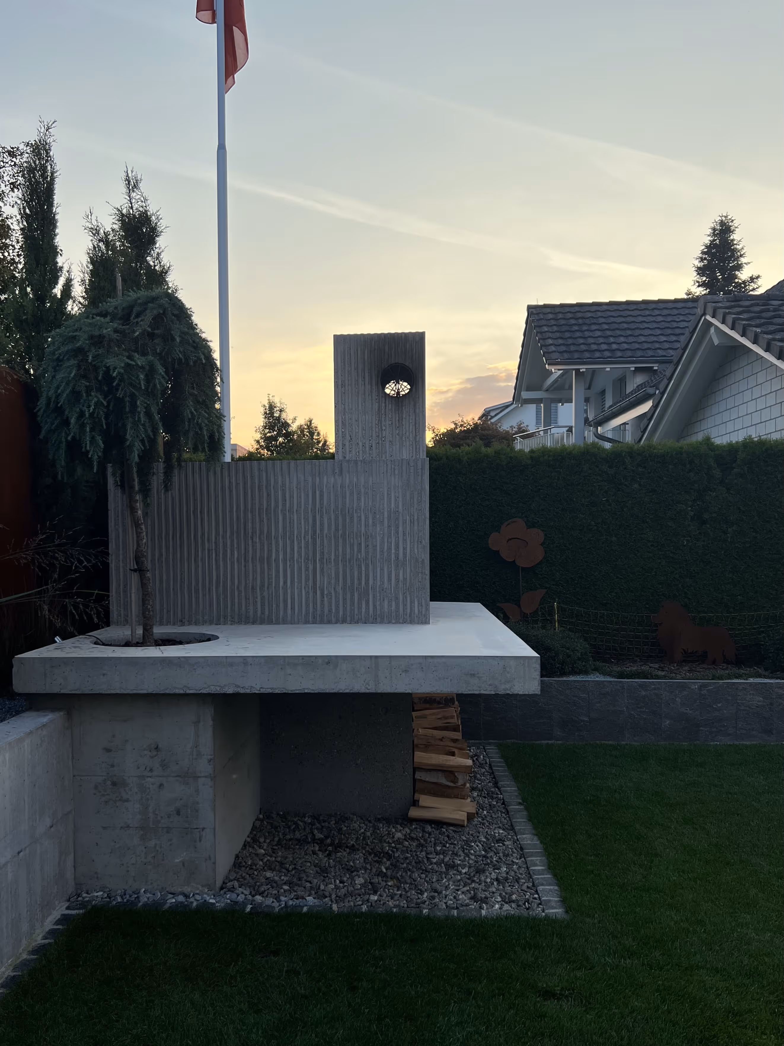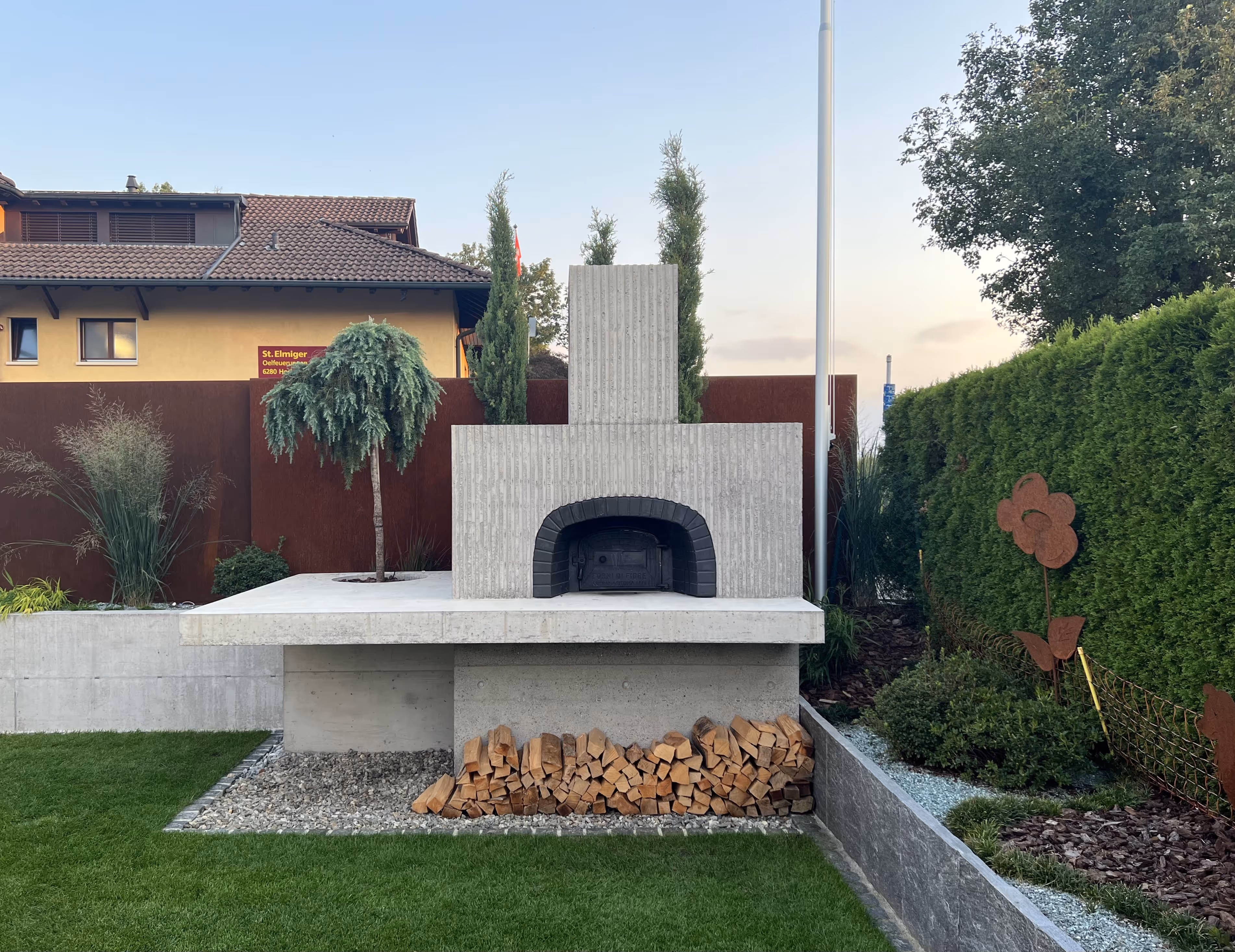 Als Leitmotiv wurde das Martinsloch nähe Elm GL verwendet. Die raue, sandgestrahlte Betonoberfläche steht in Kontrast mit den schalungsglatten Nuten der Betonschalung. Die massive Erscheinung wird durch einen runden Rauchauslass im Kamin sowie einem Loch für einen Strauch durchbrochen. Eine grosszügige Ablagefläche, welche als Holzlager sowie zur Zutatenauslege und Zubereitung der Pizzas dient, erscheint als horizontales und glattes Gegenelement zum Ofen.