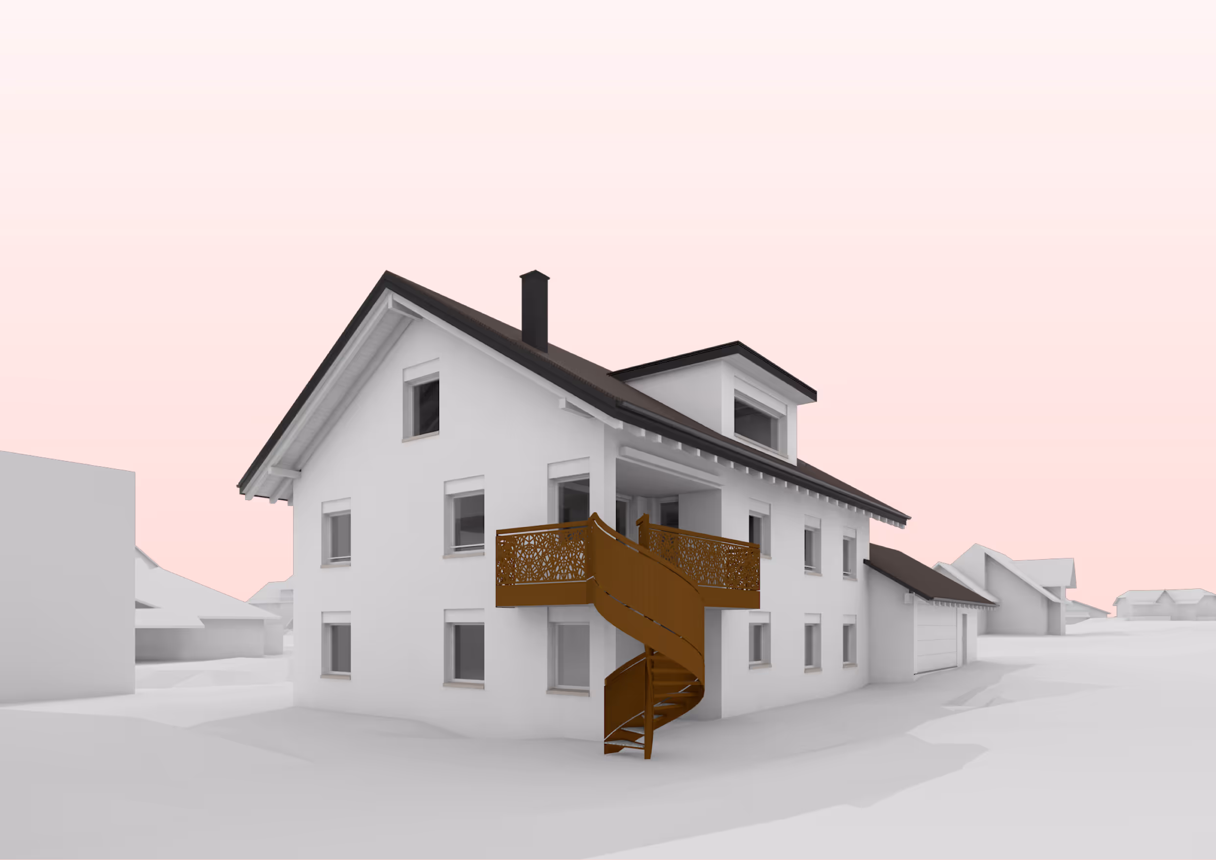 Schiebetüren ermöglichen das Verschliessen der Zimmer und zugleich eine flexible Offenheit.Die Fassade bleibt weitgehend unverändert. Vorgesehen sind eine Photovoltaikanlage zur Eigenstromversorgung sowie neue Fenster und Storen. Einflügelig ausgeführte Fenster beruhigen das vorhandene unruhige Fassadenbild und wirken zeitgemässer. Der Verzicht auf die Mittelpartie erhöht ausserdem den Lichteintrag in die Innenräume. Prägend bleiben das perforierte bronzene Balkongeländer mit Wendeltreppe in den Garten aus dem Jahr 2021 sowie die in gefärbtem Beton ausgebildeten Brüstungen. Fenster, Storen und Blenden werden in einer zurückhaltenden Farbe gewählt, um ihre Präsenz zu reduzieren.